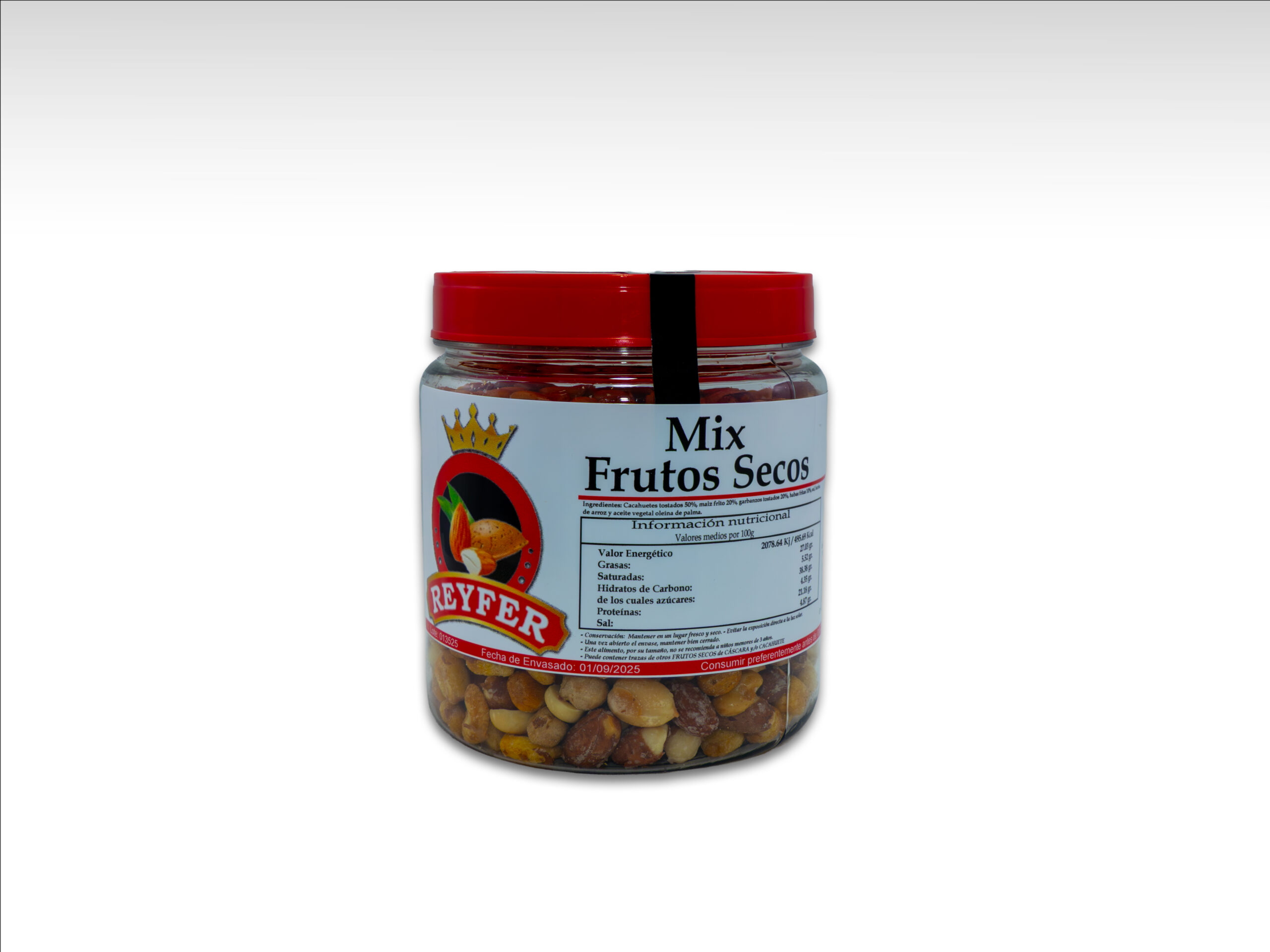 Ingredientes: Cacahuetes tostados (47%), garbanzo tostado (13%), pistacho (5%),Avellana tostada (3%), maíz frito en aceite vegetal oleína de palma 22%, Almendra tostada (10%), harina de arroz y sal.